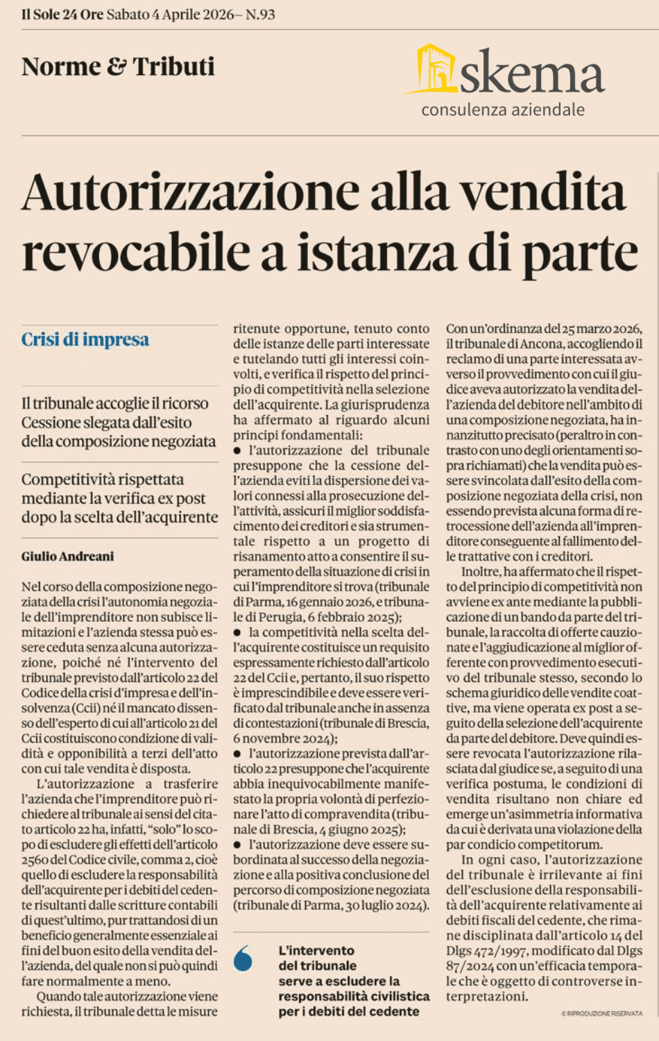 Il precedente nasce dall’attività difensiva dell’Avv. Fabio Pari, partner di Skema e specialista in diritto societario (M&A) e crisi d’impresa, che ha impostato il reclamo su una lettura sostanziale dell’art. 22 del Codice della crisi. Una tesi poi accolta dal Tribunale in composizione collegiale, con una decisione che contribuisce a definire in modo più chiaro il perimetro del controllo giudiziale nelle operazioni di cessione aziendale in ambito CNC. Il tema ha assunto rilievo anche sul piano del dibattito professionale e applicativo, tanto da essere oggetto di approfondimento da parte de Il Sole 24 Ore, che ha dedicato un articolo alla decisione e al principio di diritto affermato.
