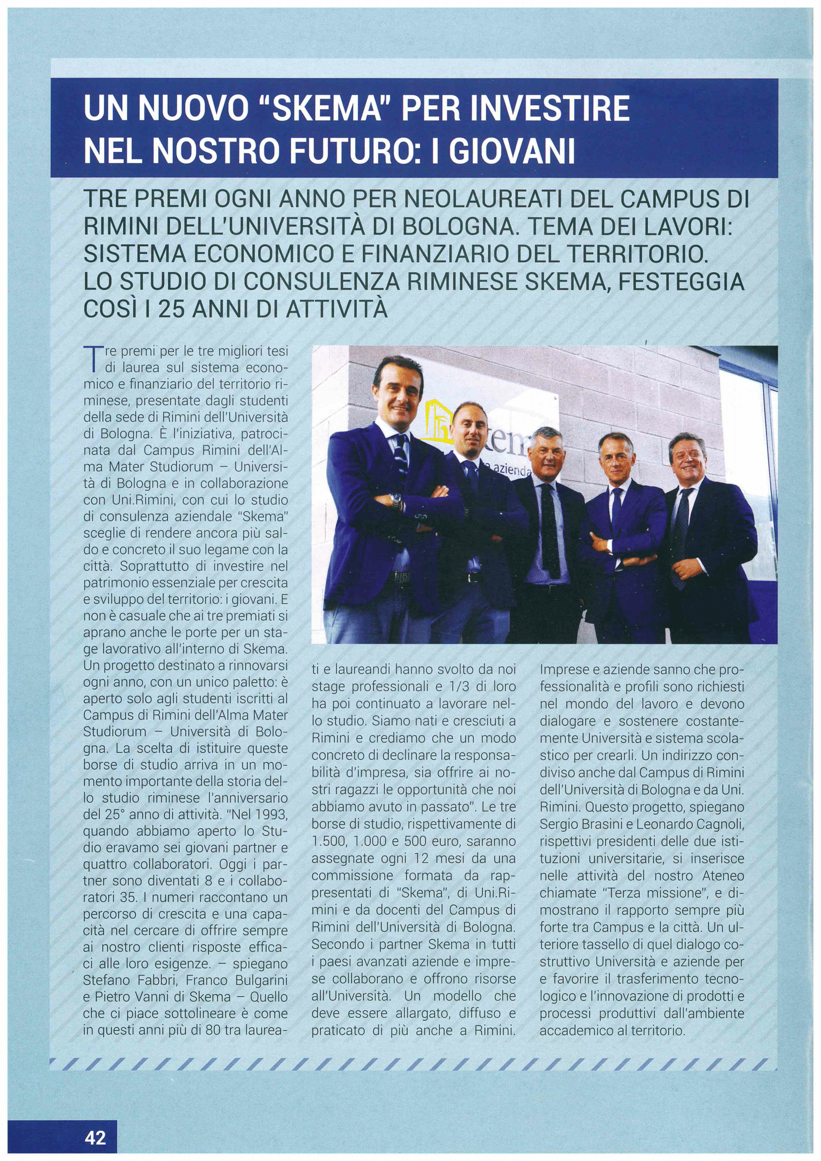 Skema, in collaborazione con l’Università di Bologna, per festeggiare i 25 anni d’attività premierà ogni anno con tre borse di studio (1.500, 1.000 e 500 euro) le migliori tesi sul sistema economico e finanziario del territorio.